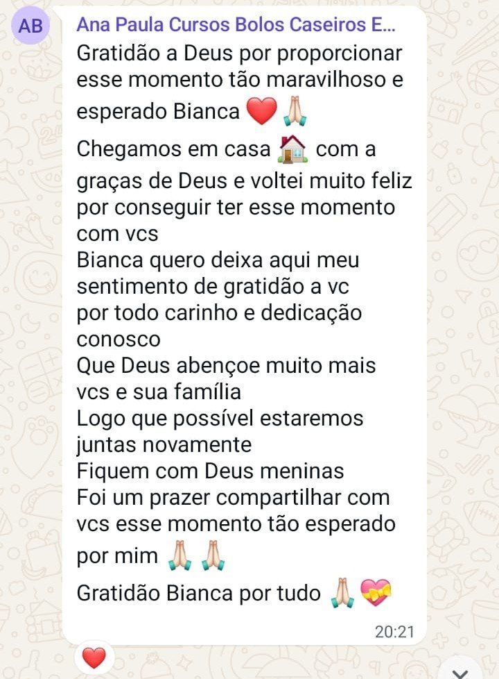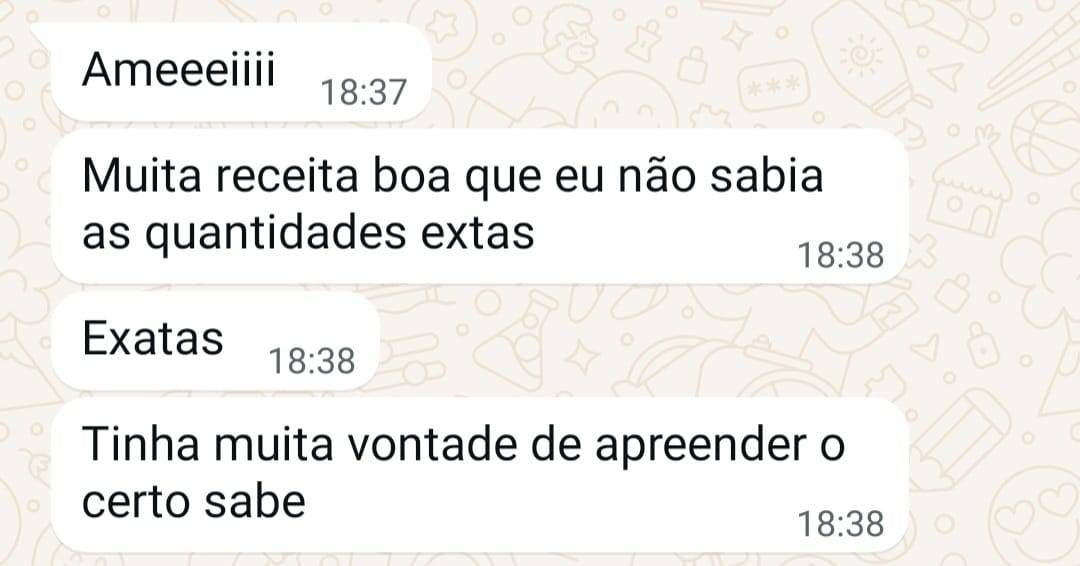Sou apaixonada por esse mundo doce da confeitaria e por isso estou sempre me dedicando a ministrar cursos presenciais e online, para que mais pessoas possam aprender, seja para fazer doces para a família, para começar um negócio ou até mesmo se aperfeiçoar na área.